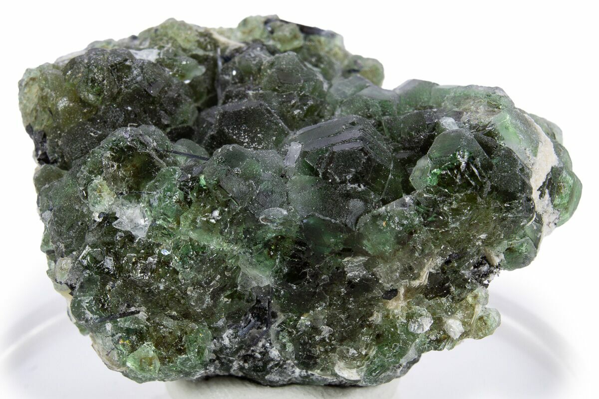 Here is a beautiful cluster of apple-green fluorite crystals that formed over muscovite and black tourmaline (schorl) crystals, collected from the Erongo Mountains in Namibia.