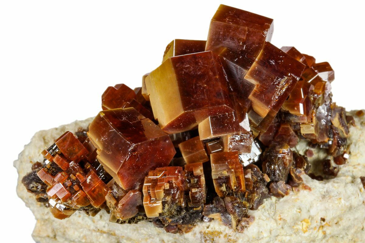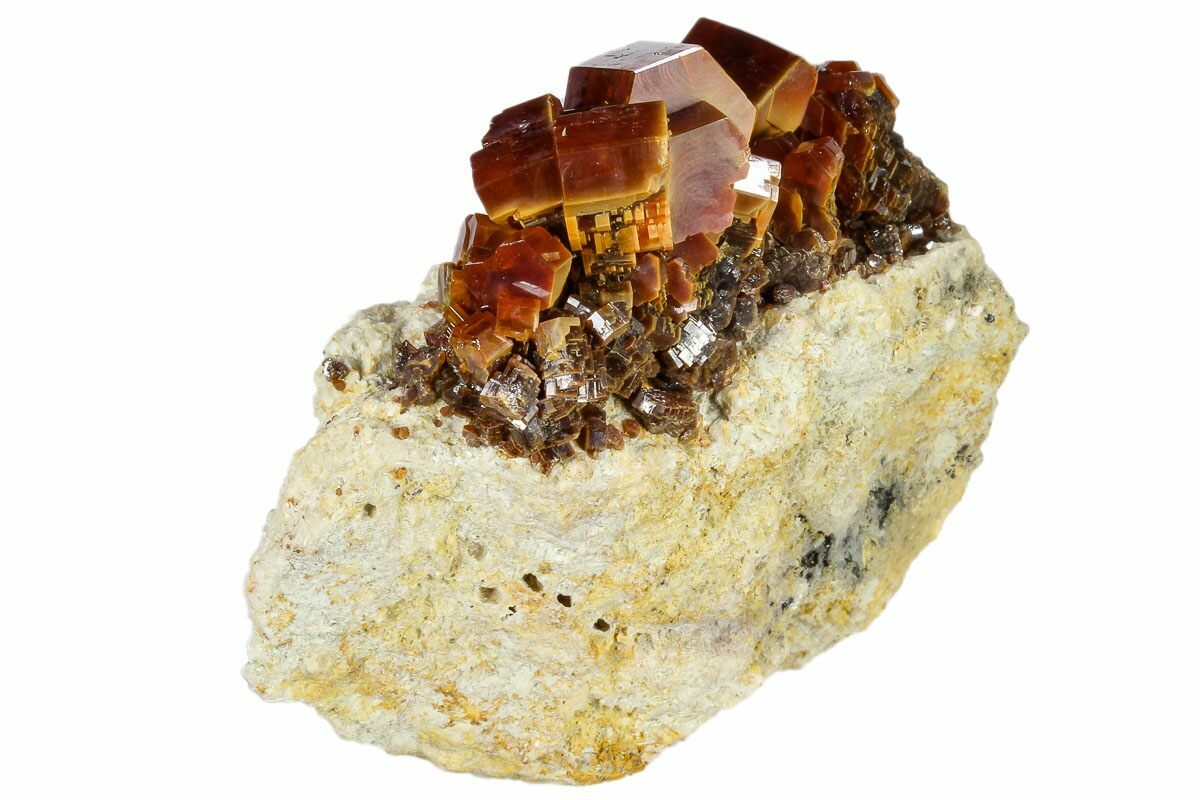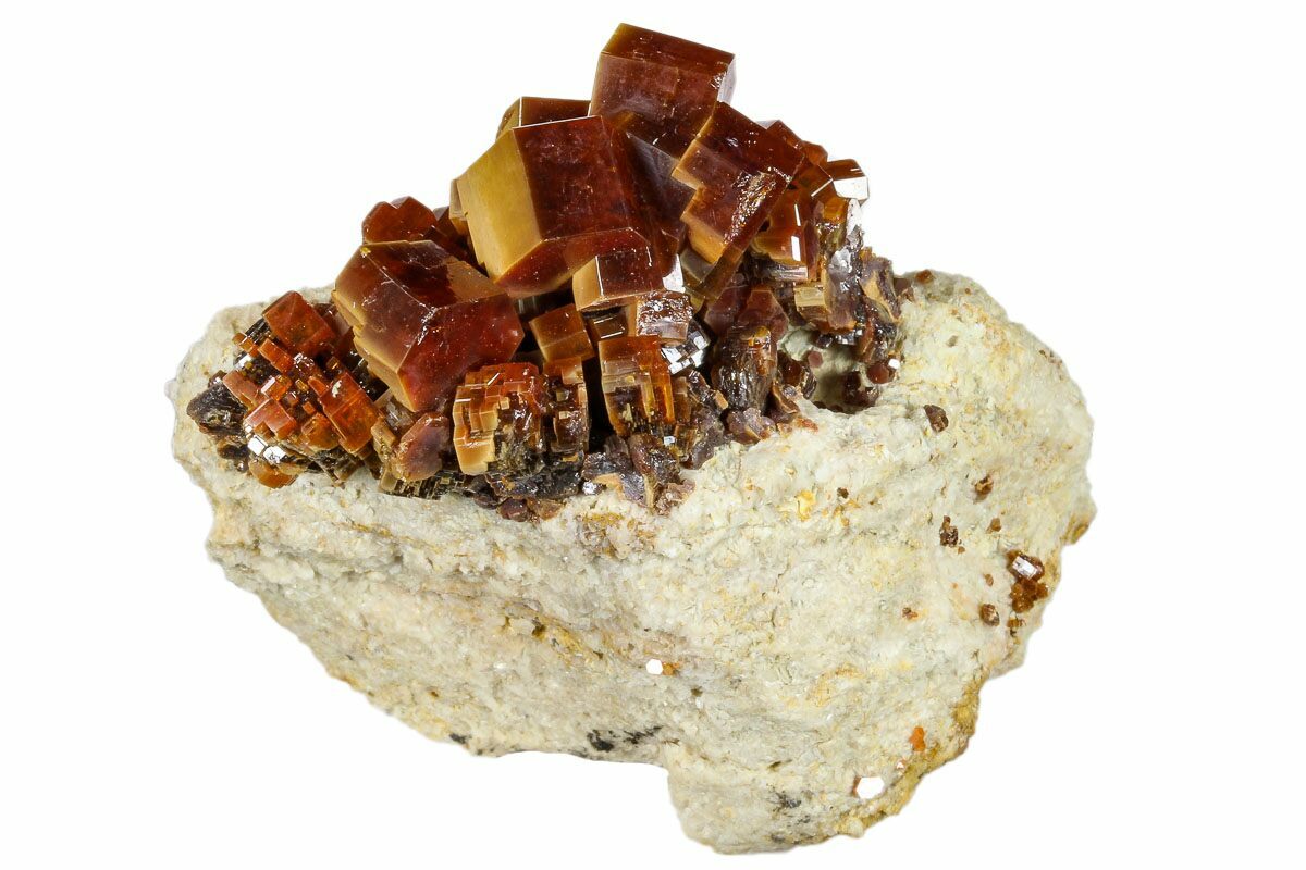 Vanadinite from Morocco is world-famous for producing some of the finest red crystal specimens on the planet. In the arid hills surrounding Mibladen and Taouz, vanadinite forms as vibrant clusters of hexagonal prisms, often with a deep crimson to orange-red color that seems to glow against the pale desert matrix. These crystals typically develop in dense groups, coating barite blades or covering weathered limestone with dazzling, glassy faces and sharp geometric symmetry. The dryness of the region and the slow oxidation of ancient lead deposits create the perfect geochemical environment for vanadinite to grow with exceptional clarity, luster, and intensity of color. Moroccan vanadinite is highly prized by collectors for its bold aesthetics, architectural crystal formations, and the consistent quality that has made these localities the global benchmark for the species.