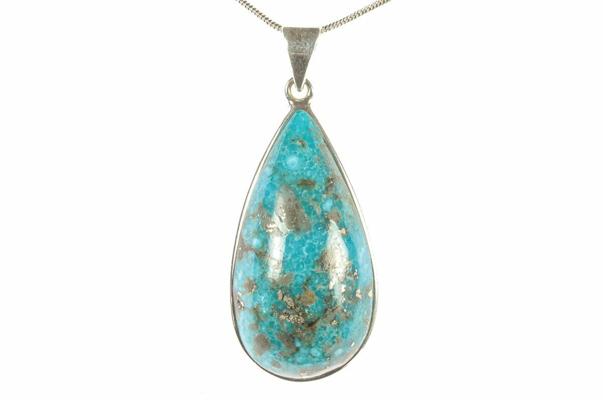 This is a beautiful polished Persian turquoise pendant set in 925 sterling silver. The pendant itself is 1.65" tall (including loop). A 24" silver plated snake chain with a lobster clasp is included with the pendant. You will receive the exact pendant pictured.
