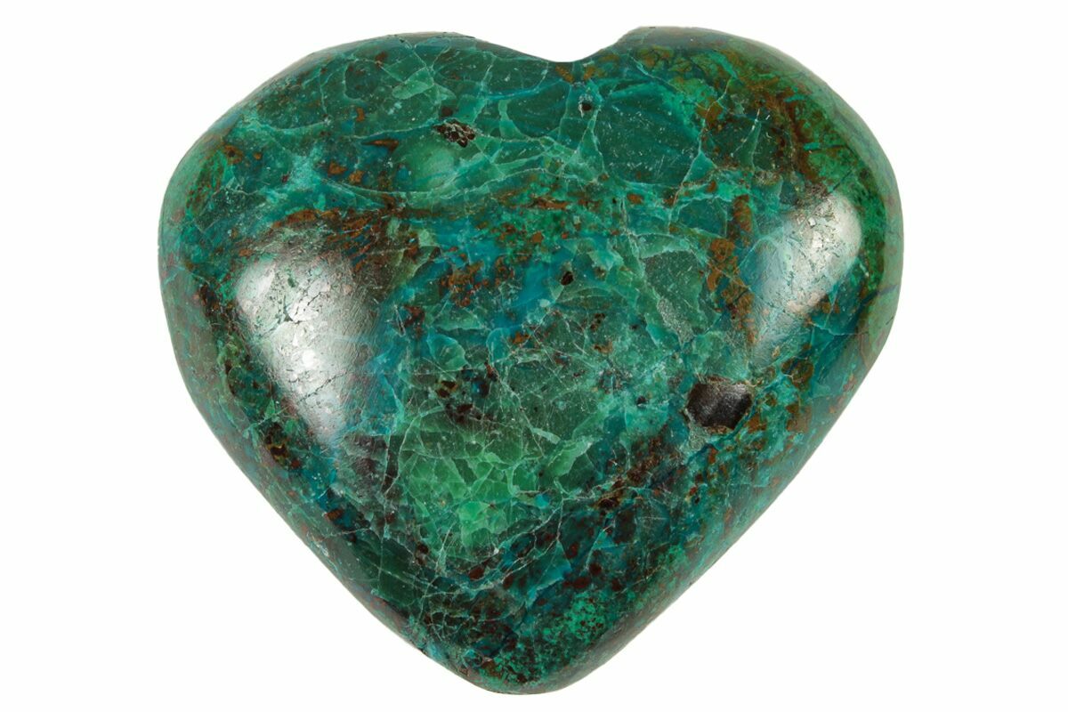 This is a gorgeous, hand-polished heart made from brilliant sky-blue chrysocolla and green malachite, collected from Peru. The lapidary work is very nice and allows for the natural formations of the mineral to be seen.