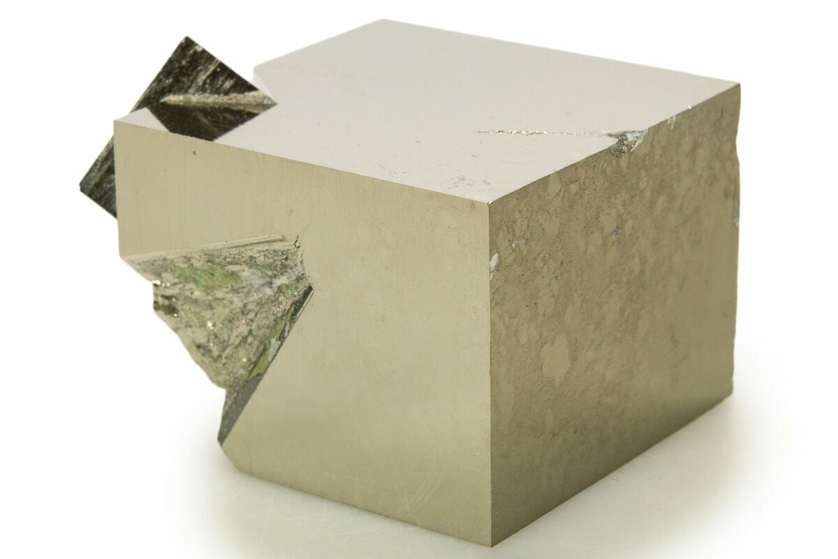 At first glance some people assume that these pyrite cubes are man-made, but the amazing thing is that they are natural! Pyrite from this location is famous for its beautiful shine, near-perfect cubic formation, and sculptural appearance. Because the matrix rock is soft, the cubes often come loose during collection. Care is taken during preparation to stabilize, repair, and make sure everything is remounted in its natural position: no specimens are composites. This means that nearly all of the pyrite cubes still in the rock from this locality have been remounted, and most clusters of multiple cubes have been stabilized.