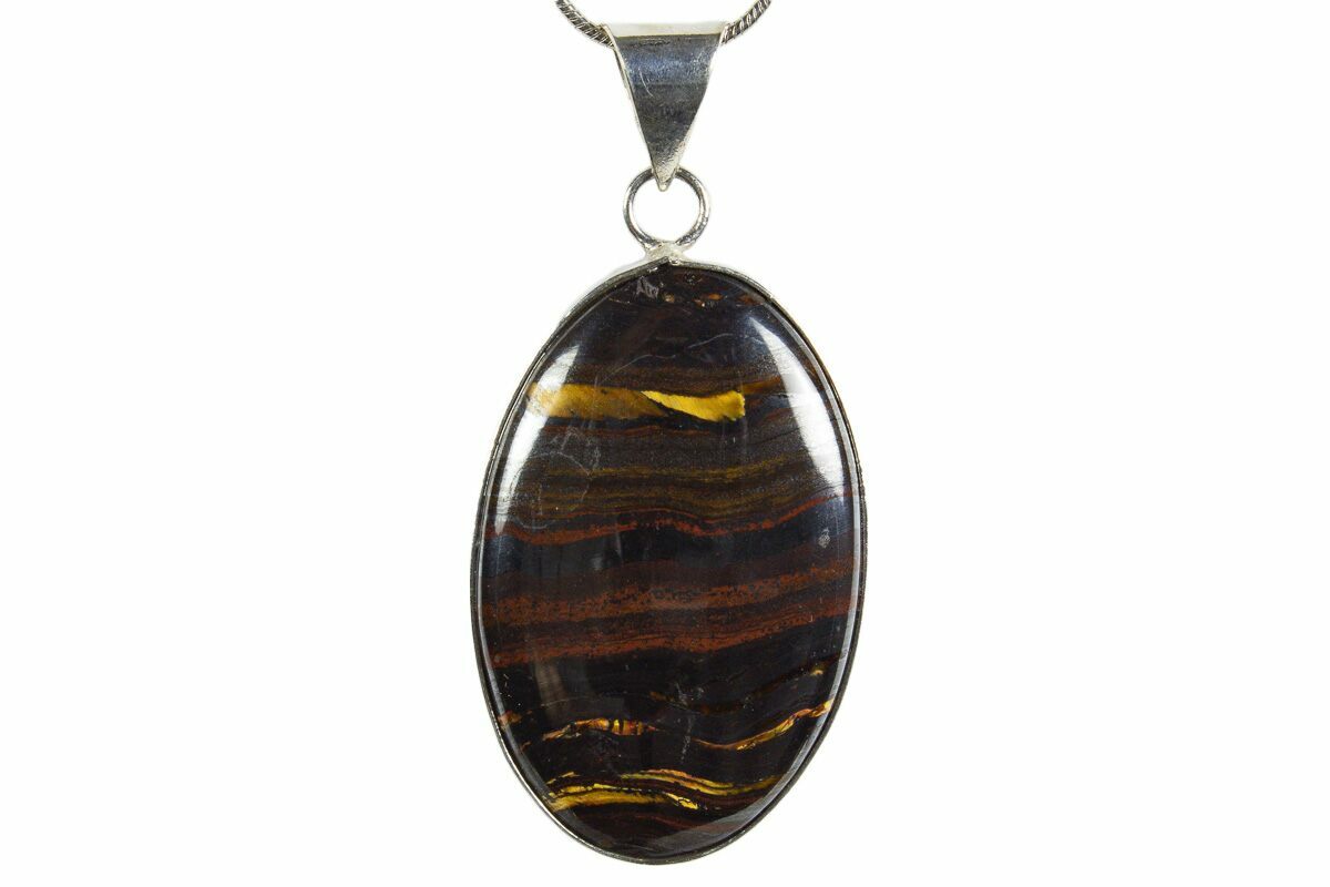 This is a stunning, 1.7" tall (including loop) pendant crafted from ancient tiger iron dating back approximately 3.02 billion years, collected from the Ord Ranges of Western Australia. The stone has been carefully shaped and polished to a high-gloss finish, revealing its dramatic bands of golden tiger’s eye, deep red jasper, and dark hematite. A 24" silver-plated snake chain with a lobster clasp is included, making it ready to wear. You will receive the exact pendant pictured.
