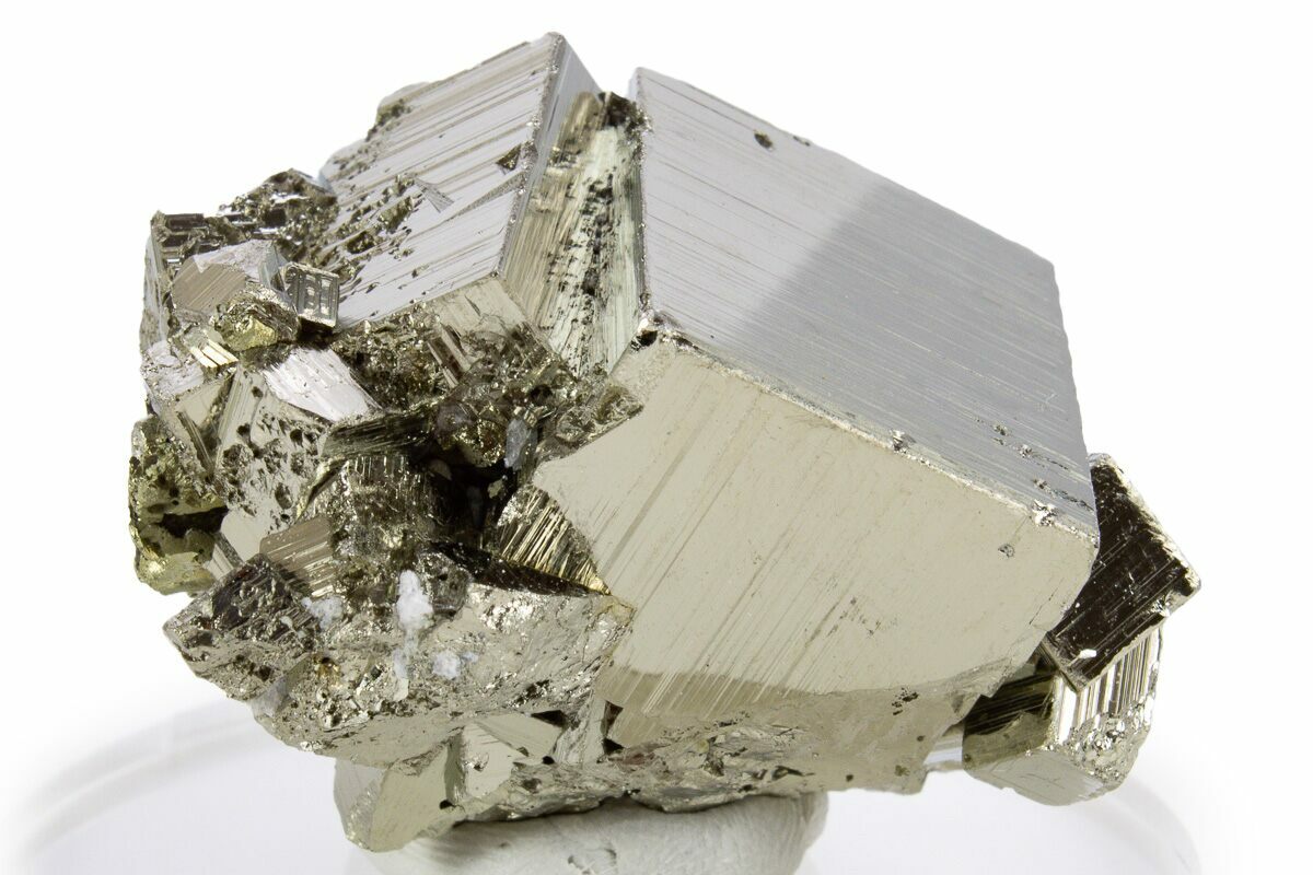 This is a gorgeous cluster of lustrous, striated cubic pyrite crystals collected from the Huanzala Mine in Peru. The entire specimen measures 1.7" wide.
