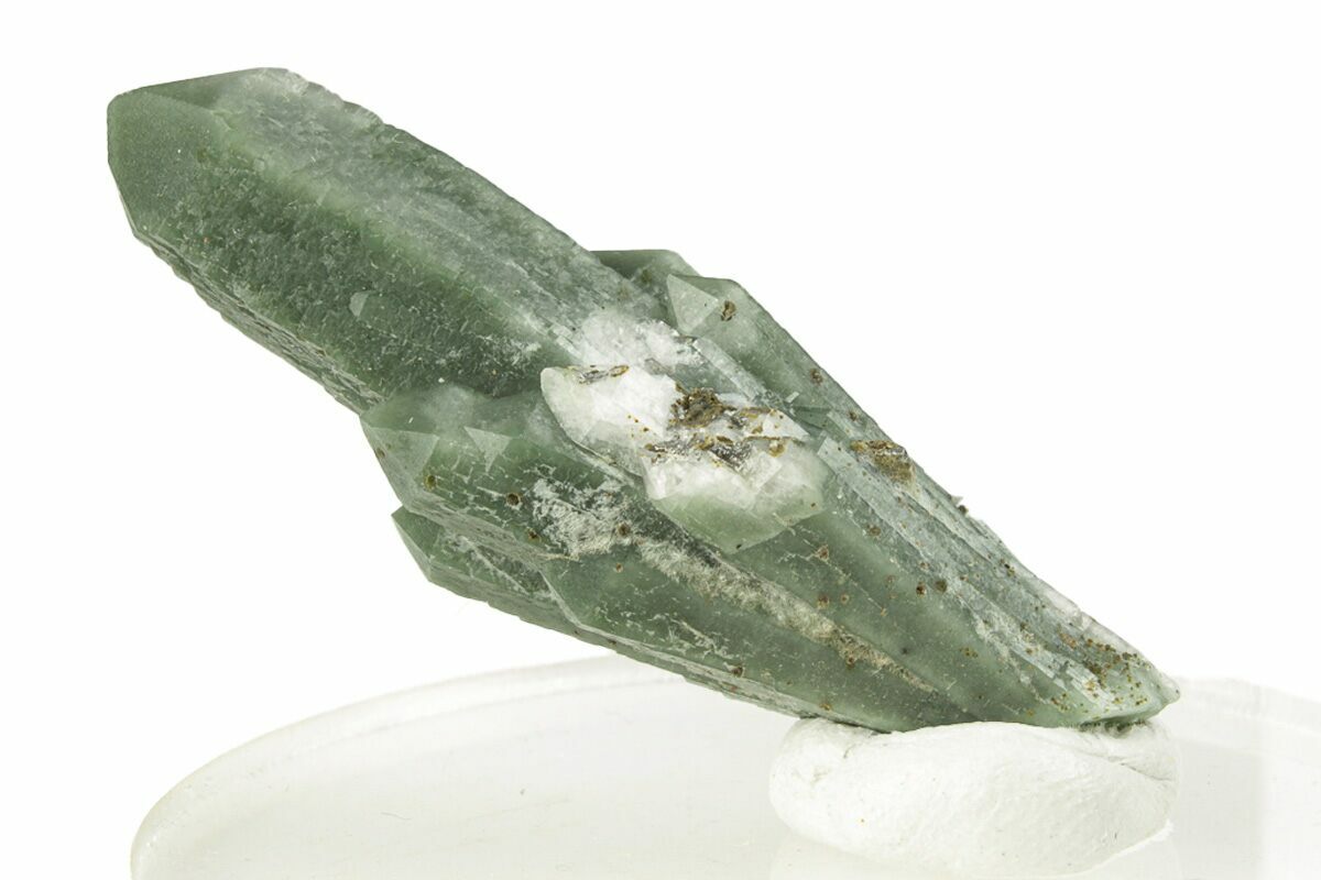 This is a unique green quartz crystal cluster collected from the Huanggang Mines of Inner Mongolia. The green color of the quartz can be attributed to hedenbergite inclusions. Small inclusions of arsenopyrite are also found around the cluster.