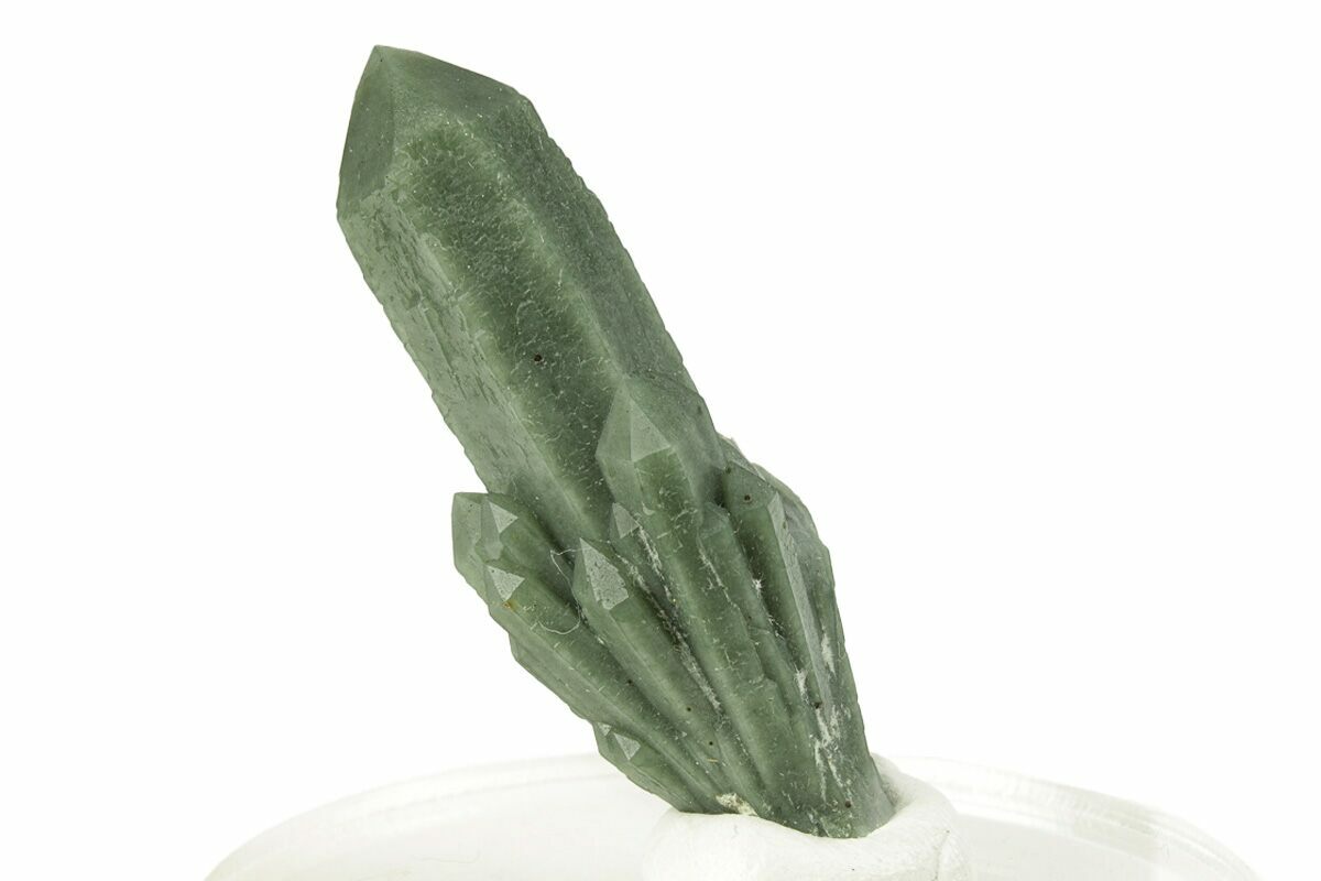 This is a unique green quartz crystal cluster collected from the Huanggang Mines of Inner Mongolia. The green color of the quartz can be attributed to hedenbergite inclusions. Small inclusions of arsenopyrite are also found around the cluster.