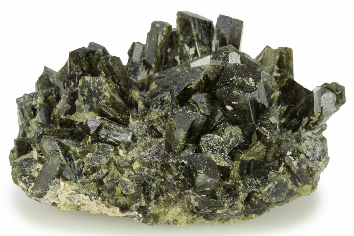 This is a beautiful epidote crystal cluster that formed from a pistachio-green matrix. This specimen was collected from Peru, however the specific mine from which it was collected is unknown. Based on the structure of the epidote crystals and the matrix, I'd say it likely came from the Lima Department or Pisco Province of Peru.
