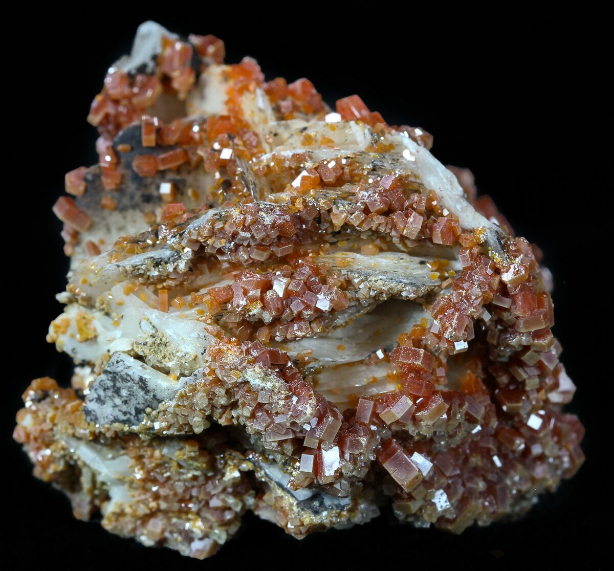 Vanadinite from Morocco is world-famous for producing some of the finest red crystal specimens on the planet. In the arid hills surrounding Mibladen and Taouz, vanadinite forms as vibrant clusters of hexagonal prisms, often with a deep crimson to orange-red color that seems to glow against the pale desert matrix. These crystals typically develop in dense groups, coating barite blades or covering weathered limestone with dazzling, glassy faces and sharp geometric symmetry. The dryness of the region and the slow oxidation of ancient lead deposits create the perfect geochemical environment for vanadinite to grow with exceptional clarity, luster, and intensity of color. Moroccan vanadinite is highly prized by collectors for its bold aesthetics, architectural crystal formations, and the consistent quality that has made these localities the global benchmark for the species.