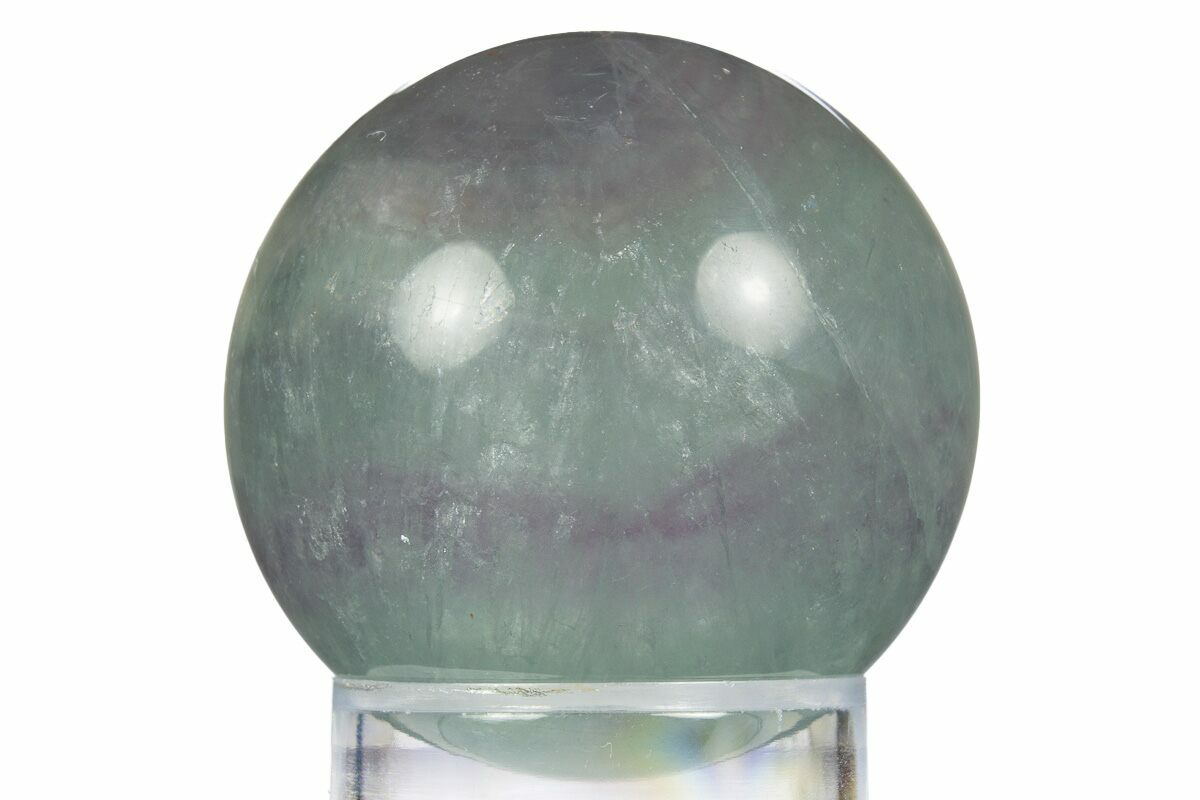 This is a beautiful, 1.7" wide polished sphere made out of light green and purple fluorite, mined in China. The quality of the polishing is excellent. Under short wave UV light, the crystals exhibit a bright blue fluorescence. Comes with the pictured display stand.