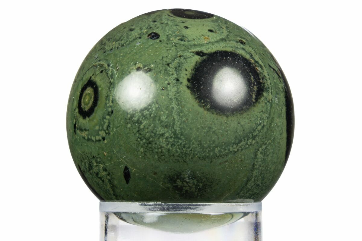 This is a beautiful hand polished sphere made from kambaba jasper found in Madagascar. It is 1.7" wide and has dark circular mineral formations throughout the green matrix.