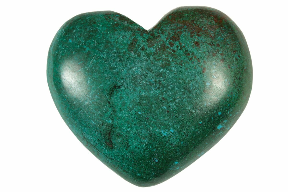 This is a gorgeous, hand-polished heart made from brilliant sky-blue chrysocolla and green malachite, collected from Peru. The lapidary work is very nice and allows for the natural formations of the mineral to be seen.