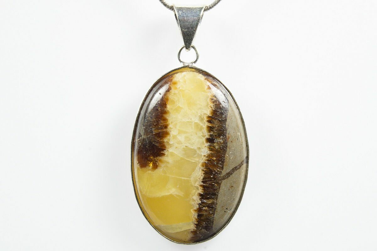 This handcrafted pendant is made from polished Madagascar septarian, showcasing the stone’s natural patterns and earthy tones. Each unique piece comes paired with a 24-inch silver-plated snake chain featuring a lobster clasp.