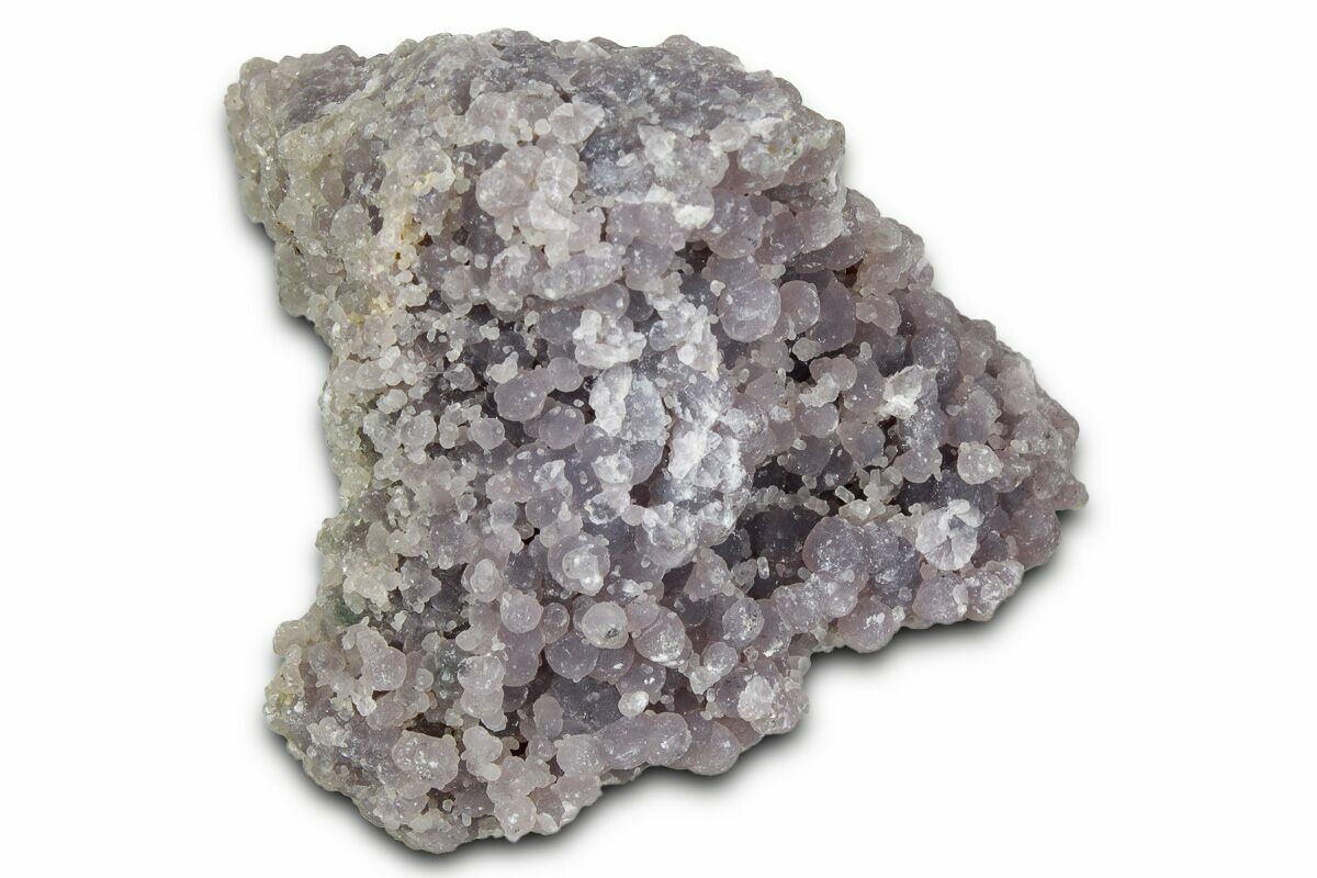 These formations were created over millions of years as silica-rich fluids filled voids and crevices in volcanic rock. As the fluids cooled, they precipitated tiny quartz crystals, which slowly grew in layers to create the nodules we see today. Its mineral composition and appearance set it apart from traditional agates, and it would be most technically correct to call it a "amethystine botryoidal chalcedony". As a collectible mineral, it’s relatively durable but should be kept out of direct sunlight to prevent color fading.