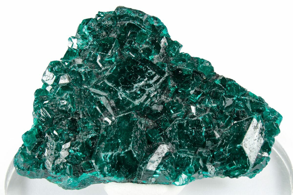 This is a sparkly 1.7" wide cluster of vibrant, emerald-green dioptase crystals mined in the Congo. The specimen features sharply terminated, glassy crystals with exceptional translucency and the intense, saturated green color that has made Congolese dioptase one of the world’s most coveted copper silicates.