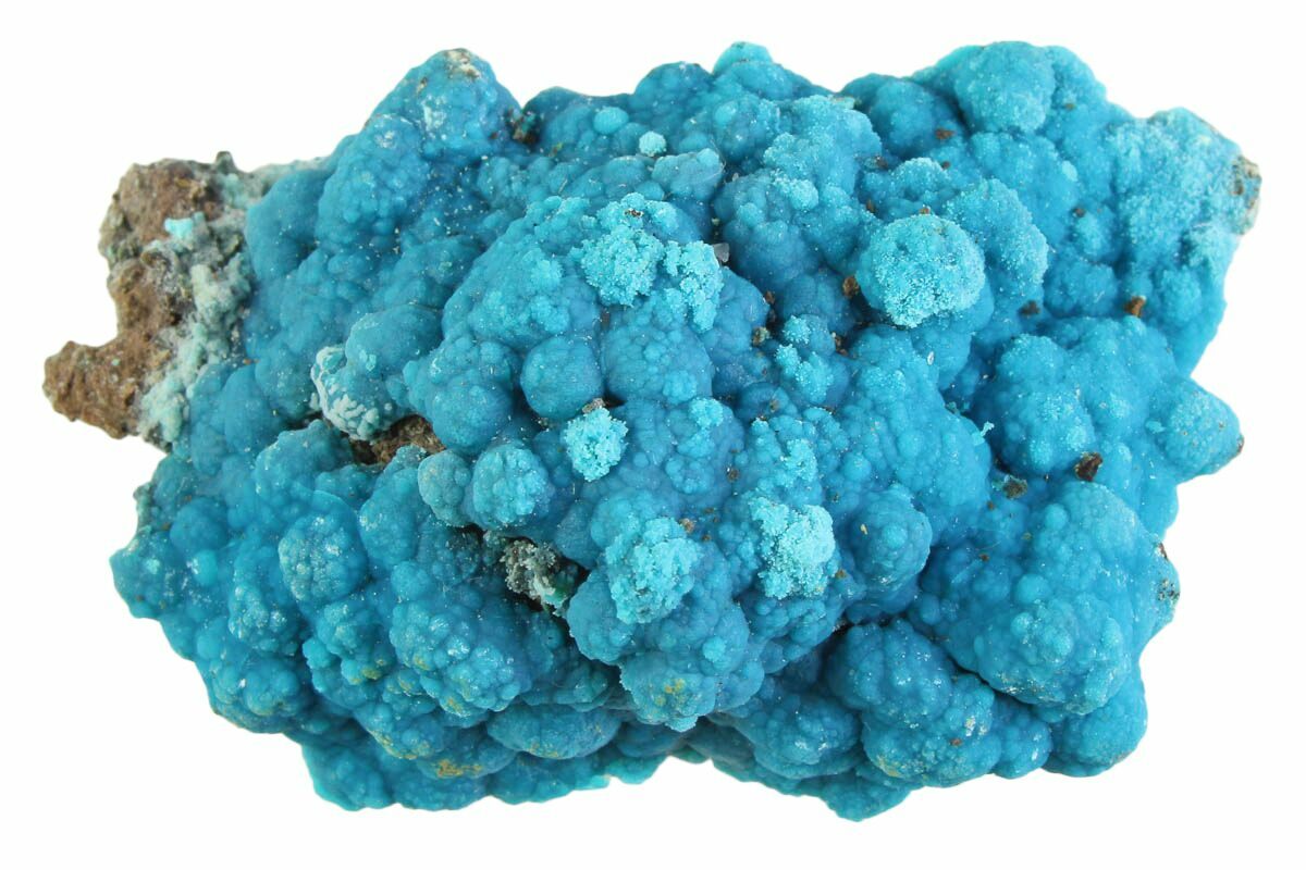 Regularly, chrysocolla will form as botryoidal lumps and spheres, rarely forming visible crystals. It can also form in both solid and fibrous veins, over fibrous minerals, and in crusts. Known for its sharp and vibrant coloring, chrysocolla can display a wide variety of colors such as bluish-green, bright green, light blue, to even sometimes multicolored specimens depending on the atmosphere present during formation.