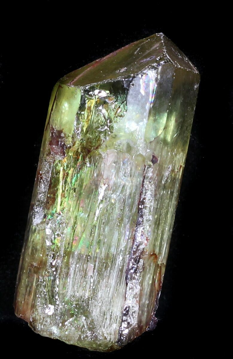 This is a mountain dew green, Fluorapatite crystal from Cerro del Mercado (Iron Mountain) at Durango, Mexico. It's completely free of the matrix and has a small amount of hematite at the base. It has some minor chips hence the bargain price.
