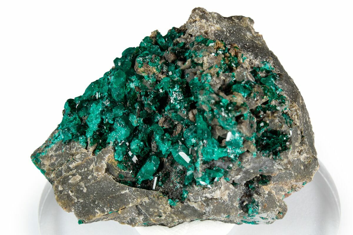 This 1.75" wide mineral specimen features a cluster of vibrant, emerald-green dioptase crystals mined in the Republic of the Congo. The crystals show off the translucency and intense, saturated green color that has made Congolese dioptase one of the world’s most coveted copper silicates.
