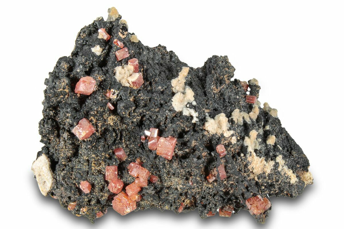 This specimen contains lustrous red vanadinite crystals on the iron oxide goethite, as well as a manganese oxide matrix. Both iron-rich and manganese-rich matrix can be seen on this specimen.