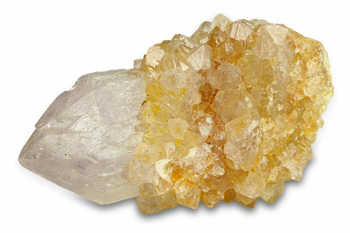 Cactus quartz, often also referred to as spirit quartz, is a variety of quartz characterized by second-generation druzy crystals growing on the faces of larger quartz crystals. The small second-generation crystals point away from the prism and their orientation is not related to the crystallographic orientation of the central crystal. Cactus quartz is currently only known from the Magaliesberg Mountains region of South Africa, and comes in a variety of shades ranging from white to deep purple to orange colorations. The deep purple amethyst points are the rarest and most coveted by collectors.