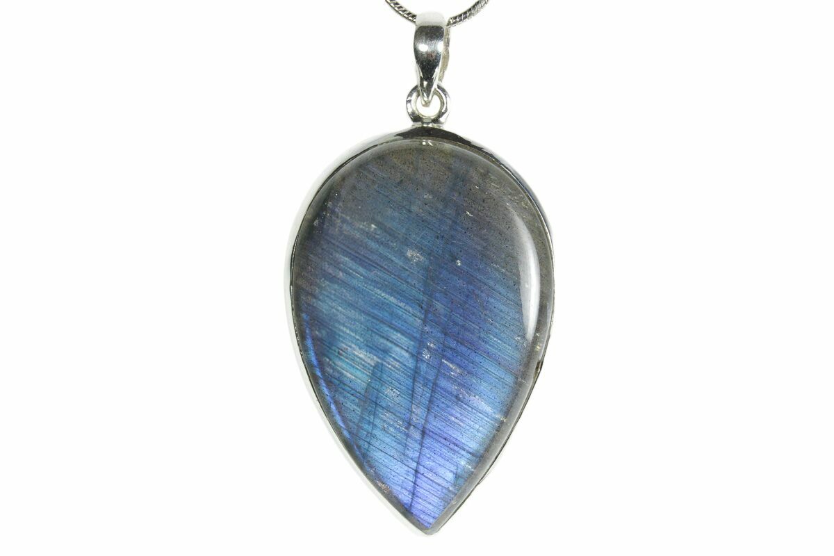 This is an eye-catching labradorite pendant featuring a beautiful, polished blue labradorite stone set in 925 sterling silver. The pendant itself is 1.8" tall (including loop). A 24" silver plated snake chain with a lobster clasp is included with the pendant. You will receive the exact pendant pictured.