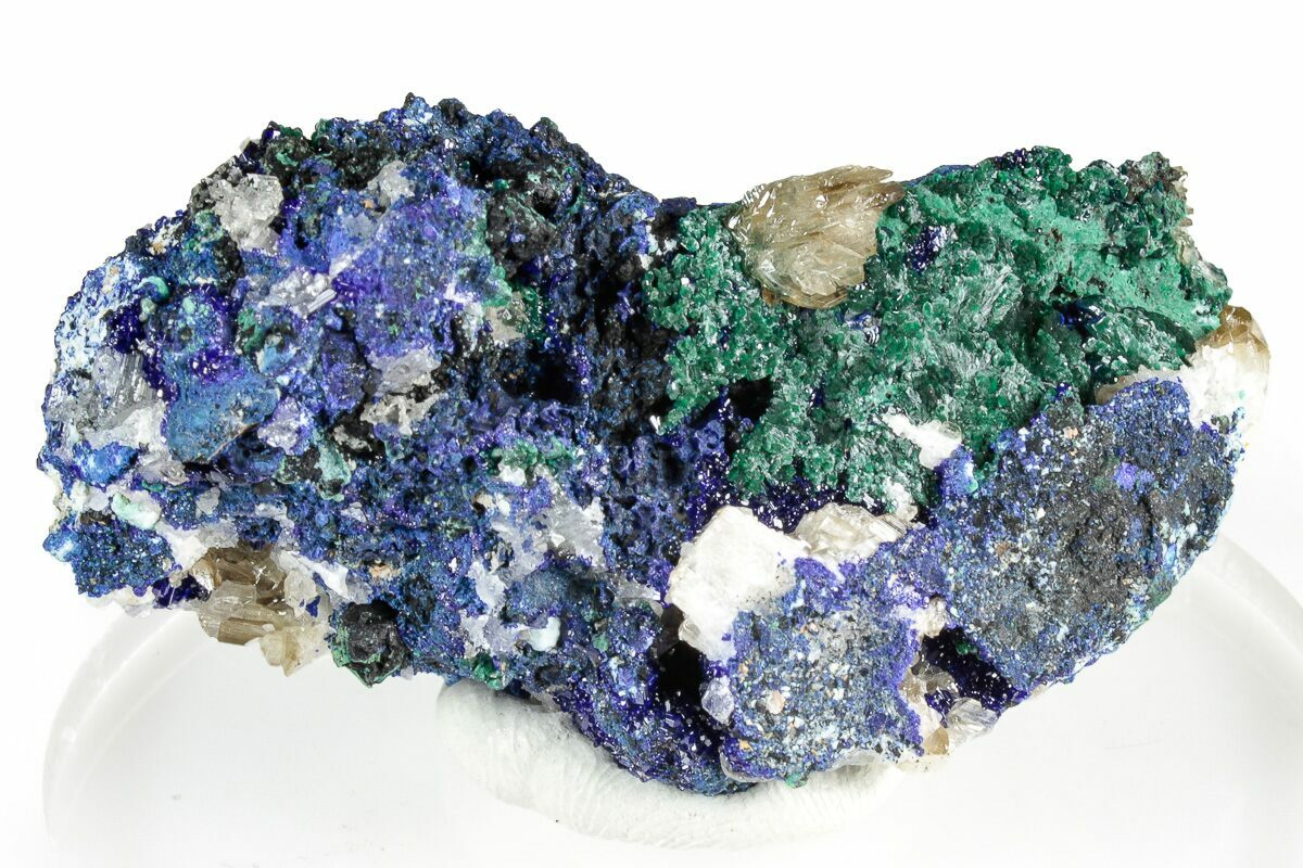 This is a 1.8" wide mineral specimen from the Yanga Koubenza quarries in the Republic of the Congo (Brazzaville). It features silky green malachite and sparkling, deep blue azurite crystals. Grey-white cerussite crystals can be found scattered across the specimen.