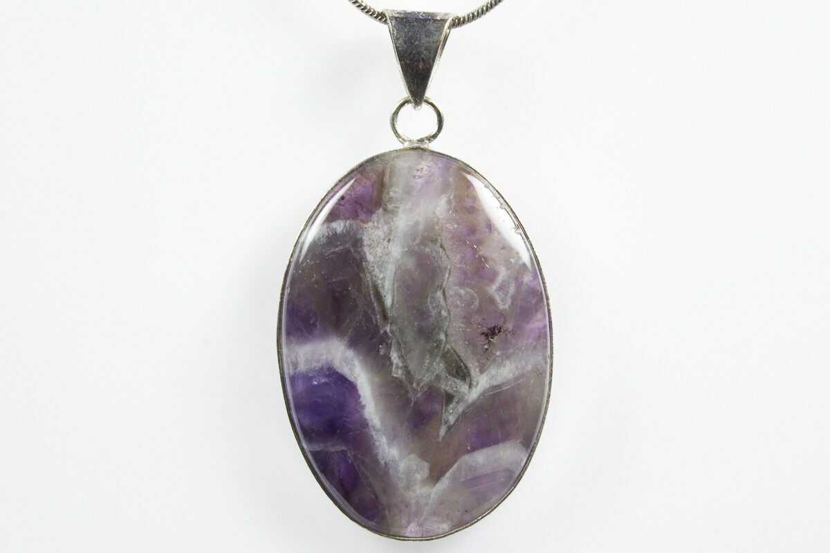 This is a beautiful, 1.8" tall chevron amethyst pendant. It comes with a 24" long, silver plated snake chain necklace.