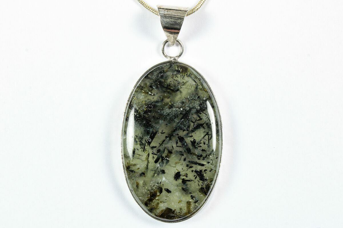 This fascinating pendant is crafted from translucent green prehnite richly included with dark green epidote crystals, creating striking natural contrast within the stone. The pendant measures approximately 1.8 inches long and is paired with a 24-inch sterling silver chain finished with a secure lobster clasp. You will receive the exact pendant shown in the photos.
