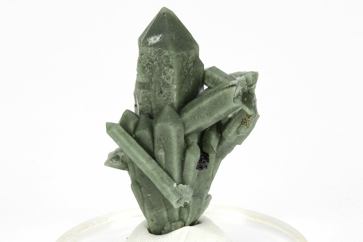 This is a green quartz crystal cluster that was collected from the Huanggang Mines of Inner Mongolia. The green color of the quartz can be attributed to hedenbergite inclusions within the quartz.