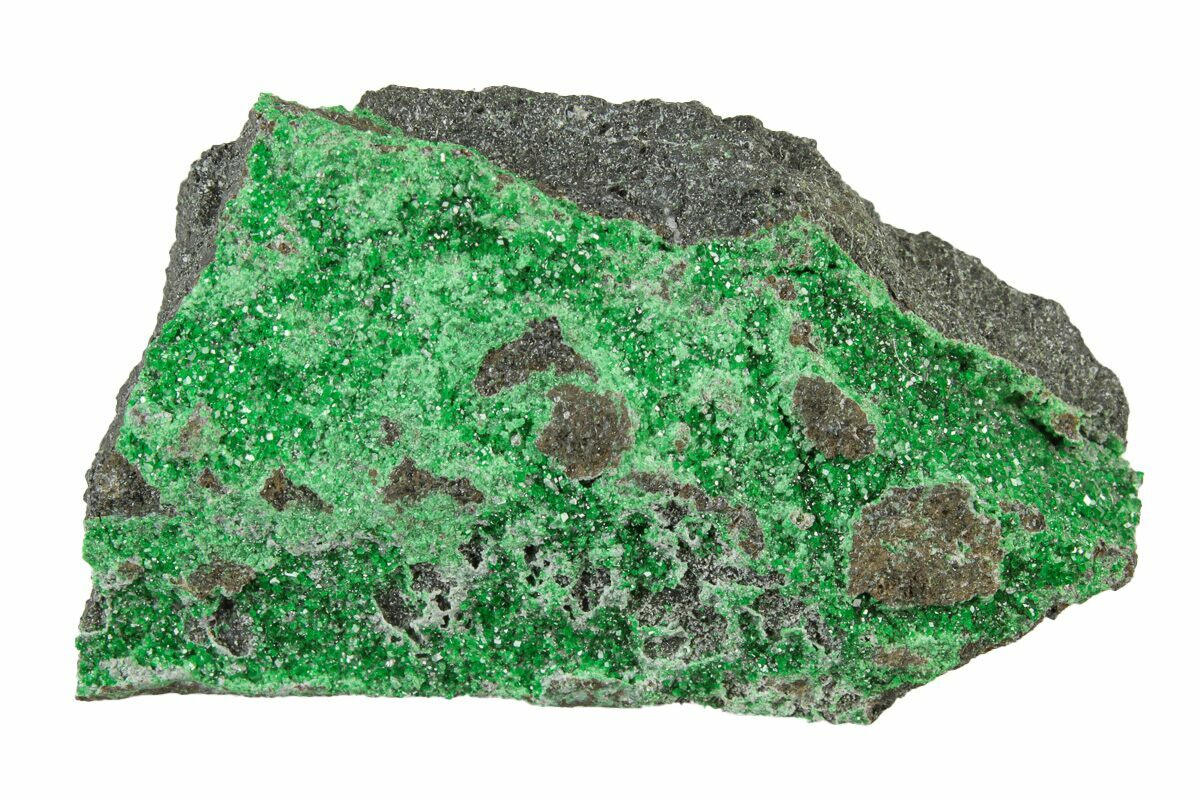 Uvarovite is a rare, chromium-rich member of the garnet group with the formula Ca₃Cr₂(SiO₄)₃, prized for its striking, naturally occurring emerald-green color. It is the only garnet species that is consistently green due to chromium, the same element that gives emerald its vivid hue. Unlike many garnets that form as larger, individual crystals, uvarovite typically occurs as dense druses or clusters of small, sharply formed dodecahedral crystals, creating a sparkling, gem-like surface across the host rock.