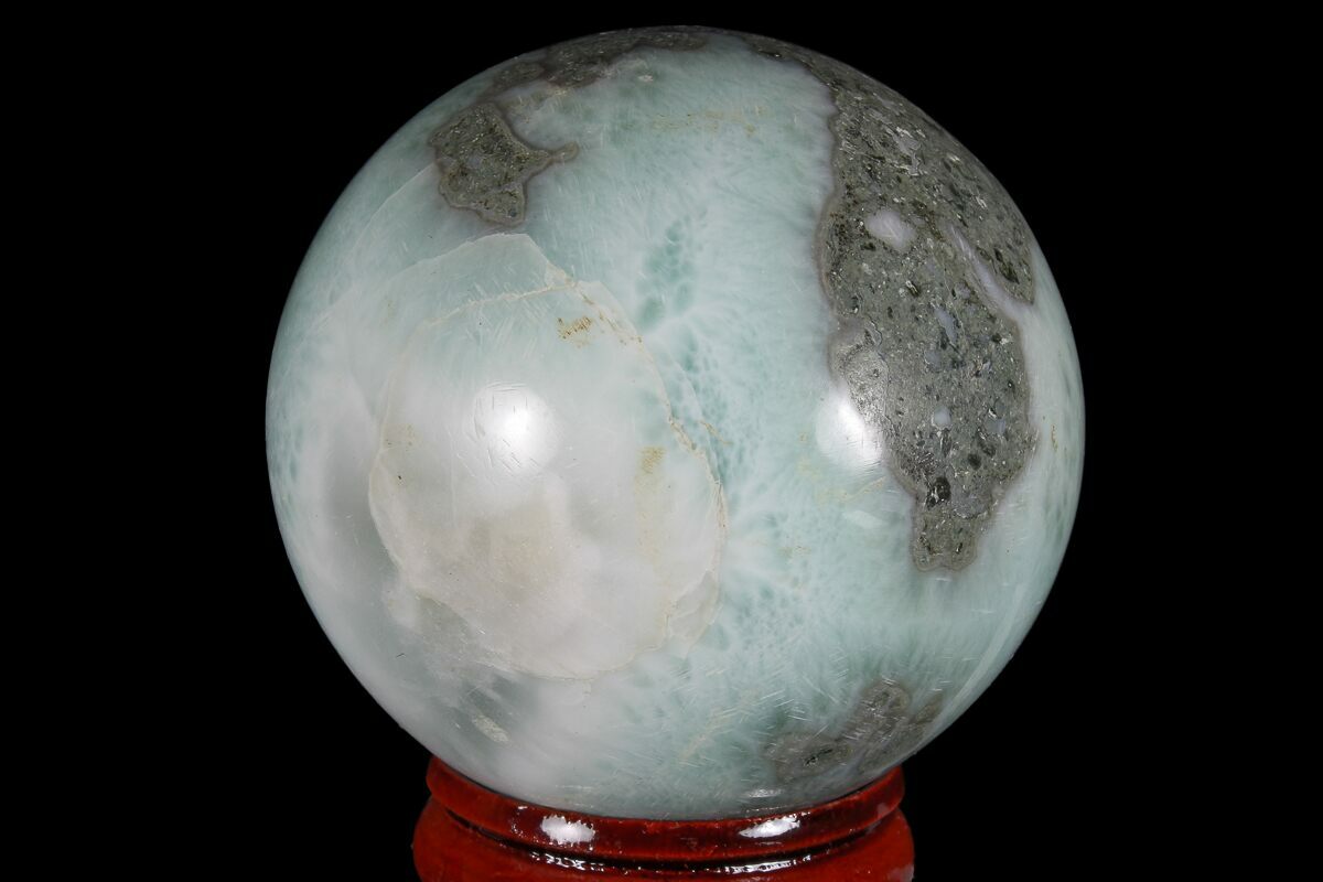 This is a stunning, 1.8" wide, hand polished sphere, made from rare Larimar from the Los Chupaderos mine in the Dominican Republic. This piece is of exceptional quality with great color and flowery patterning. Comes with the pictured display stand.