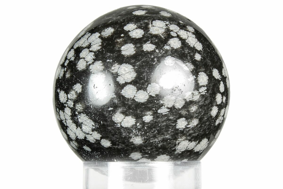 This is a 1.8" wide, sphere made from snowflake obsidian collected near Sevier Lake in Millard County, Utah. It has been polished to a glossy finish and comes with an acrylic ring display stand.