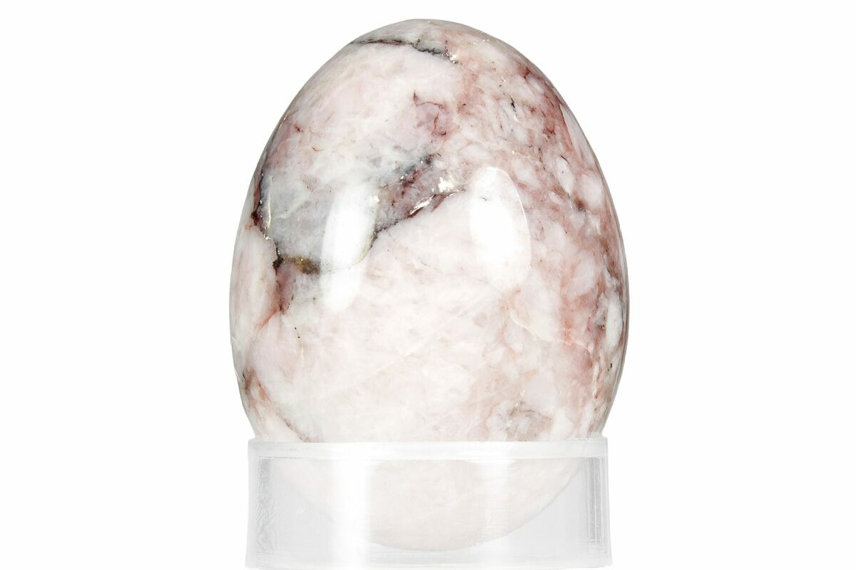 This is a 1.8" tall polished egg made of strawberry quartz from South Africa. The "strawberry" effect is caused by iron oxide or hematite, while the black seams can be related to high-quality black mica biotites, creating a distinctive "black strawberry quartz" look. It comes with an acrylic ring display stand.