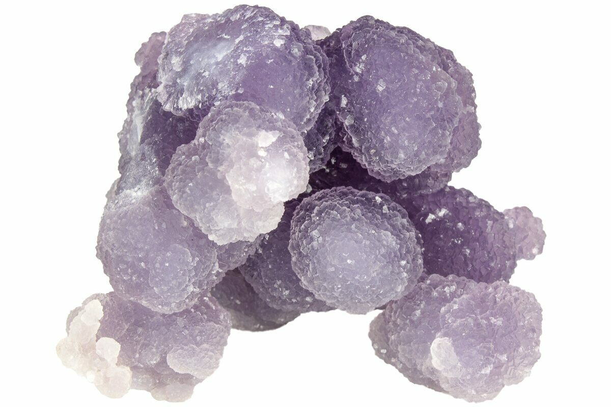 These formations were created over millions of years as silica-rich fluids filled voids and crevices in volcanic rock. As the fluids cooled, they precipitated tiny quartz crystals, which slowly grew in layers to create the nodules we see today. Its mineral composition and appearance set it apart from traditional agates, and it would be most technically correct to call it a "amethystine botryoidal chalcedony". As a collectible mineral, it’s relatively durable but should be kept out of direct sunlight to prevent color fading.