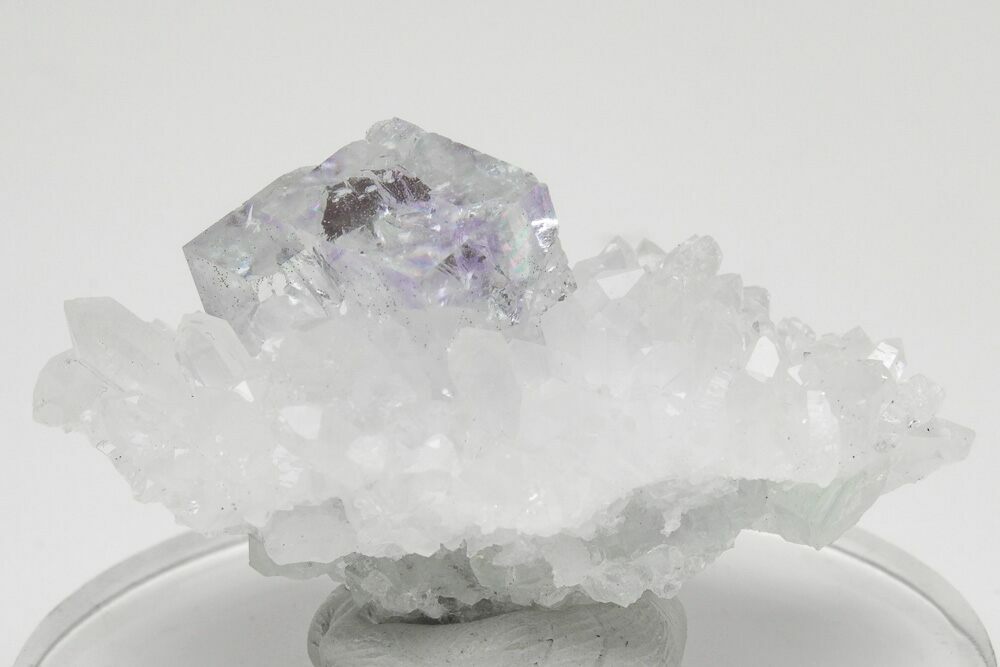 This is a gorgeous cluster of glass-clear, cubic fluorite crystals with purple zones that formed from a quartz crystal encrusted matrix. It comes out of the Hunan Province of China, a region known for its stunning fluorite formations.