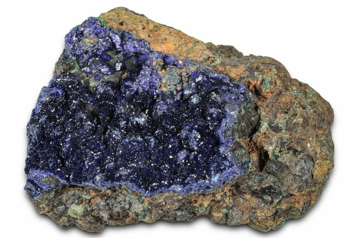 Azurite and malachite are two closely related copper minerals that frequently form together, creating some of the most striking natural color combinations found in the mineral world. Because their chemical compositions are so similar, only subtle changes in the environment during formation—especially the amount of water present—can influence which mineral becomes more dominant. Conditions with greater moisture tend to favor the development of malachite, while drier settings allow azurite to accumulate more readily.