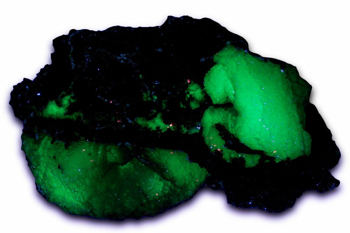 Under shortwave ultraviolet light, these adamite aggregations exhibit a vibrant green fluorescence.