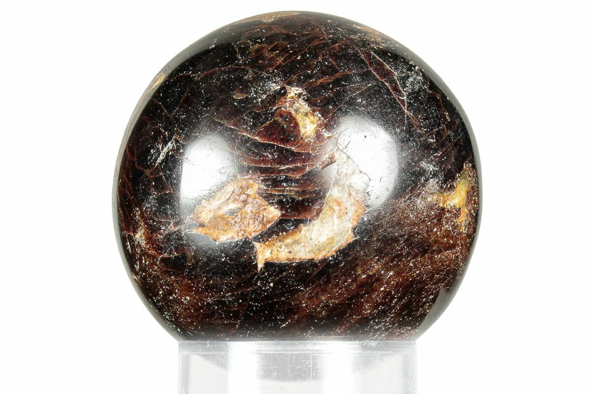 This is a 1.85" wide sphere made of deep-red/brown almandine garnet, collected in India. It has been polished to a smooth finish.