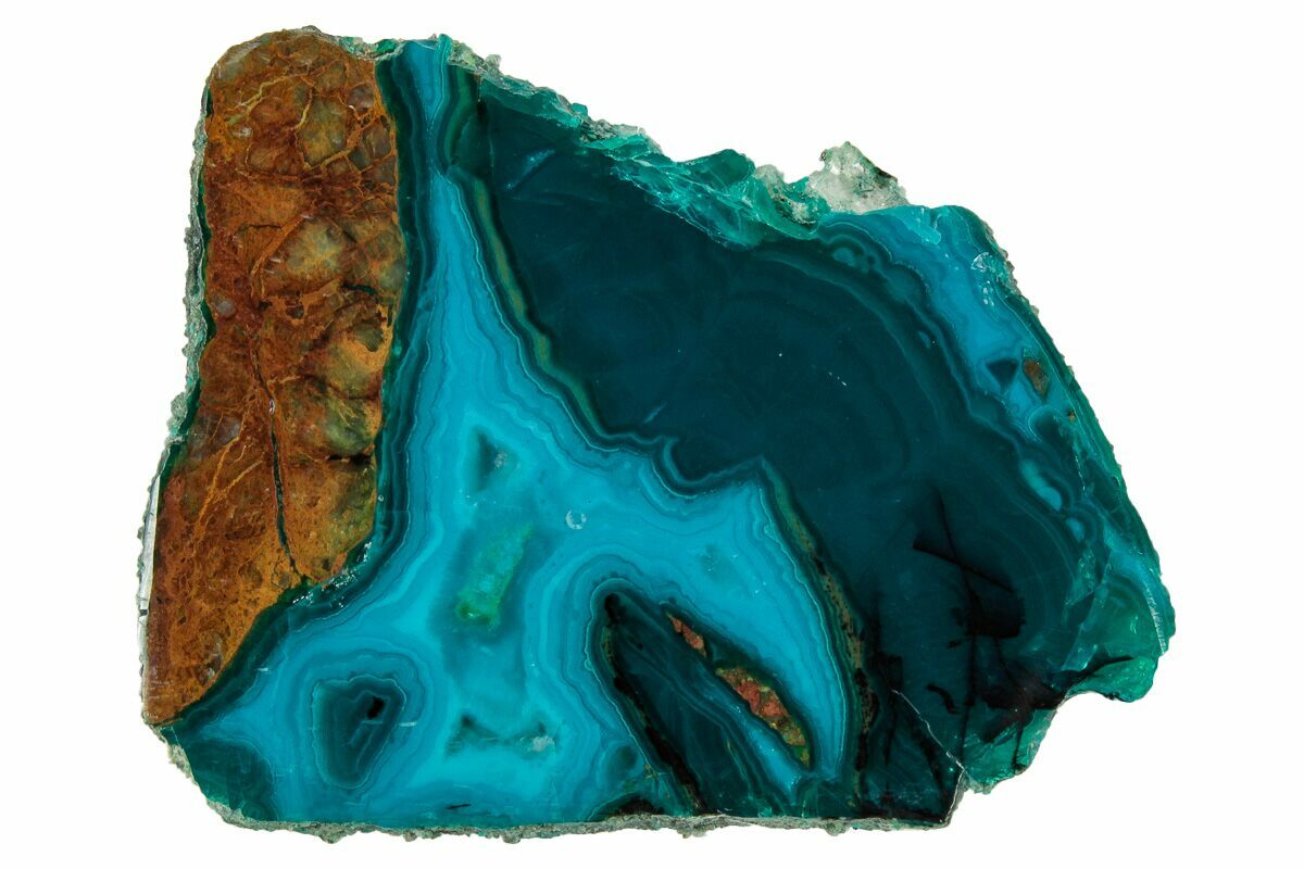 This is a vibrant, polished slab of banded chrysocolla and malachite, collected from the Bagdad Copper Mine in Arizona. It is a wonderful, banded pattern of blue-green to deep blue chrysocolla and green malachite that has been polished to a glossy finish on one side.