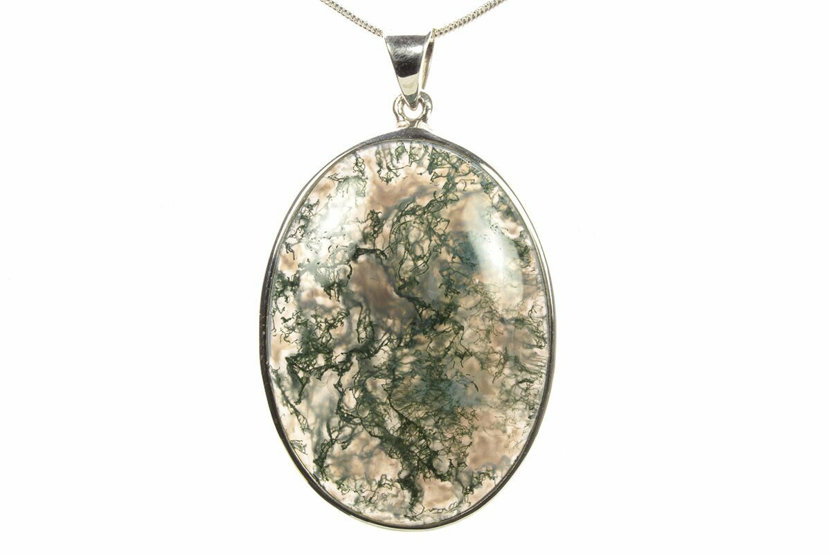 This is a beautiful, 1.85" long pendant of moss agate collected from the Deccan Traps of western India. It features beautiful green moss-like formations scattered throughout the agate. It has been set in 925 sterling silver and comes with a 24" silver-plated snake chain.