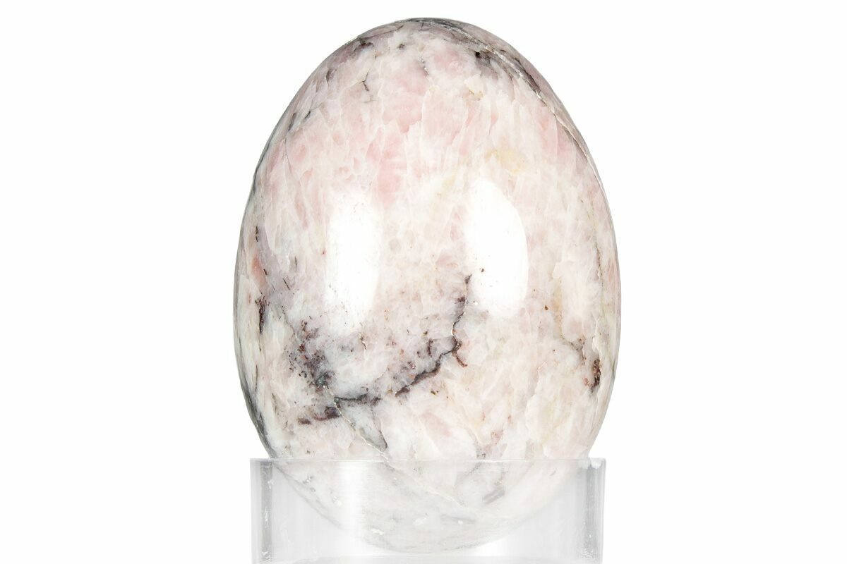 This is a 1.85" tall polished egg made of strawberry quartz from South Africa. The "strawberry" effect is caused by iron oxide or hematite, while the black seams can be related to high-quality black mica biotites, creating a distinctive "black strawberry quartz" look. It comes with an acrylic ring display stand.