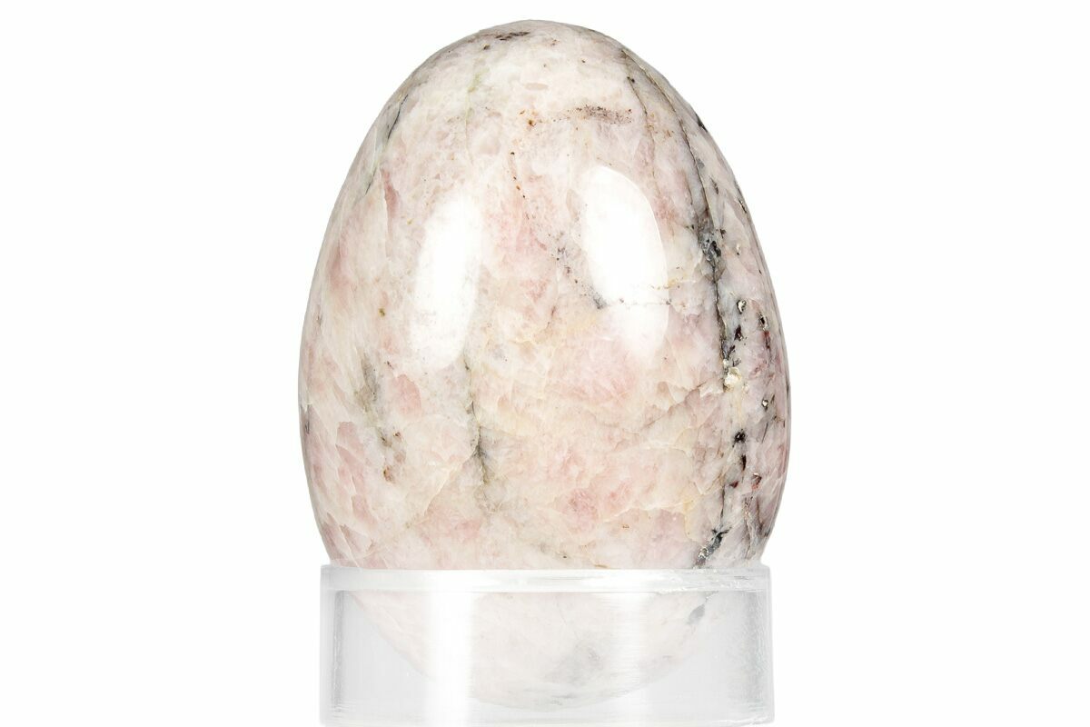 This is a 1.85" tall polished egg made of strawberry quartz from South Africa. The "strawberry" effect is caused by iron oxide or hematite, while the black seams can be related to high-quality black mica biotites, creating a distinctive "black strawberry quartz" look. It comes with an acrylic ring display stand.
