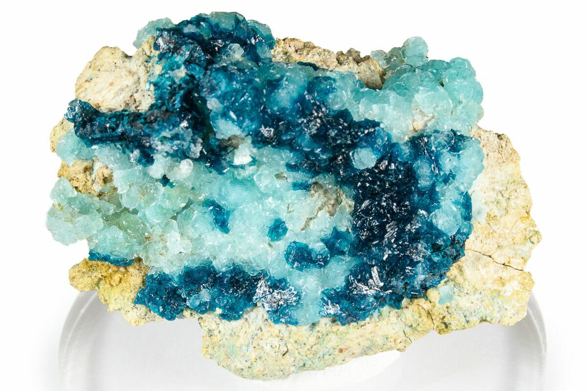 This is a stunning, 1.85" wide cluster of vibrant blue veszelyite crystals that formed over sky-blue hemimorphite. It was collected from the hemimorphite zone of the Palabanda Quarry in the Republic of the Congo (Brazzaville).
