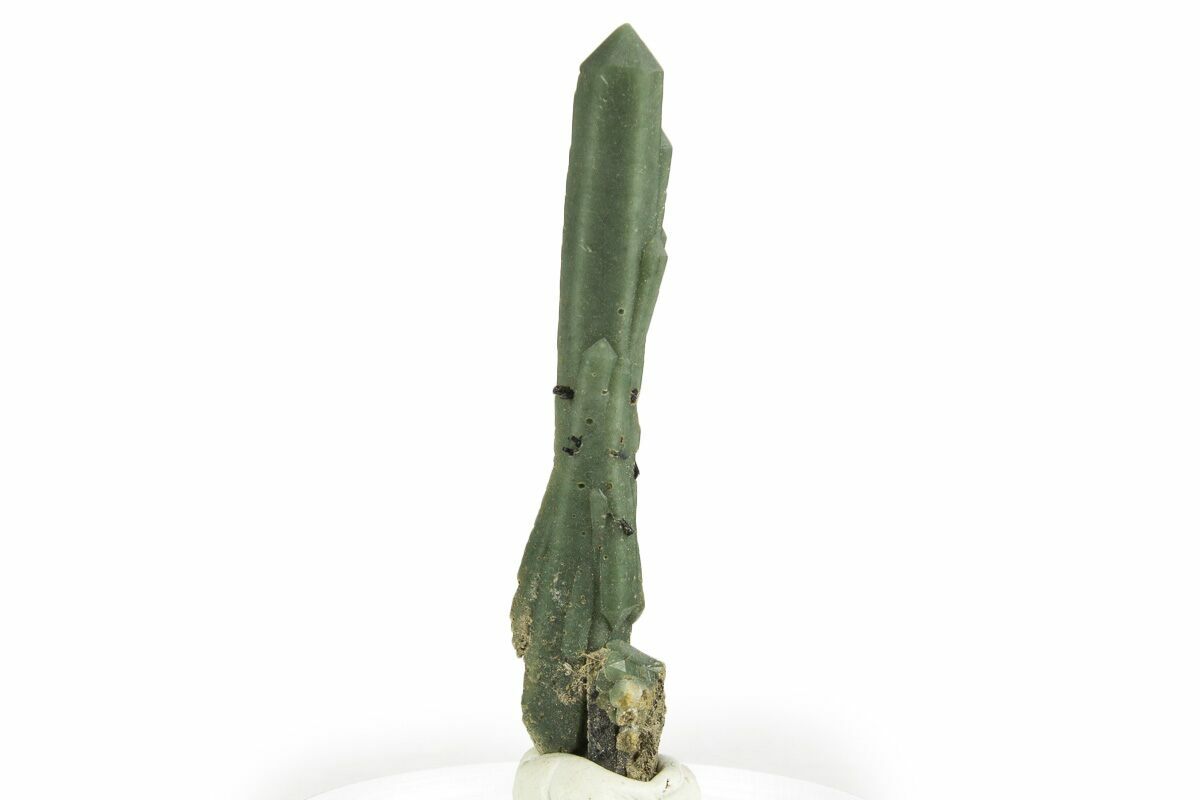 This is a unique green quartz crystal cluster collected from the Huanggang Mines of Inner Mongolia. The green color of the quartz can be attributed to hedenbergite inclusions. Portions of the crystal display lustrous black ilvaite crystals.