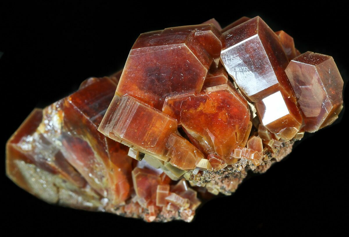 This is a beautiful grouping of huge deep red and light brown, vanadinite crystals from Midelt, Morocco. They exhibit excellent color saturation, and a mirror luster on an iron-rich matrix. This specimen is a cluster of large, high quality crystals.