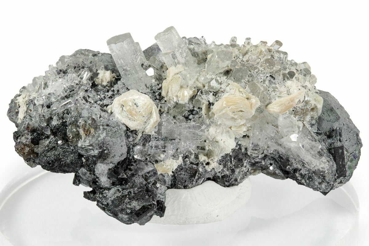 This is a gorgeous specimen that features lustrous, light blue aquamarine crystals with mica aggregations on a mixture of fluorite and black tourmaline, collected from the Erongo Mountains in Namibia. It measures 1.9" wide and has been mounted to an acrylic display base with mineral tack.