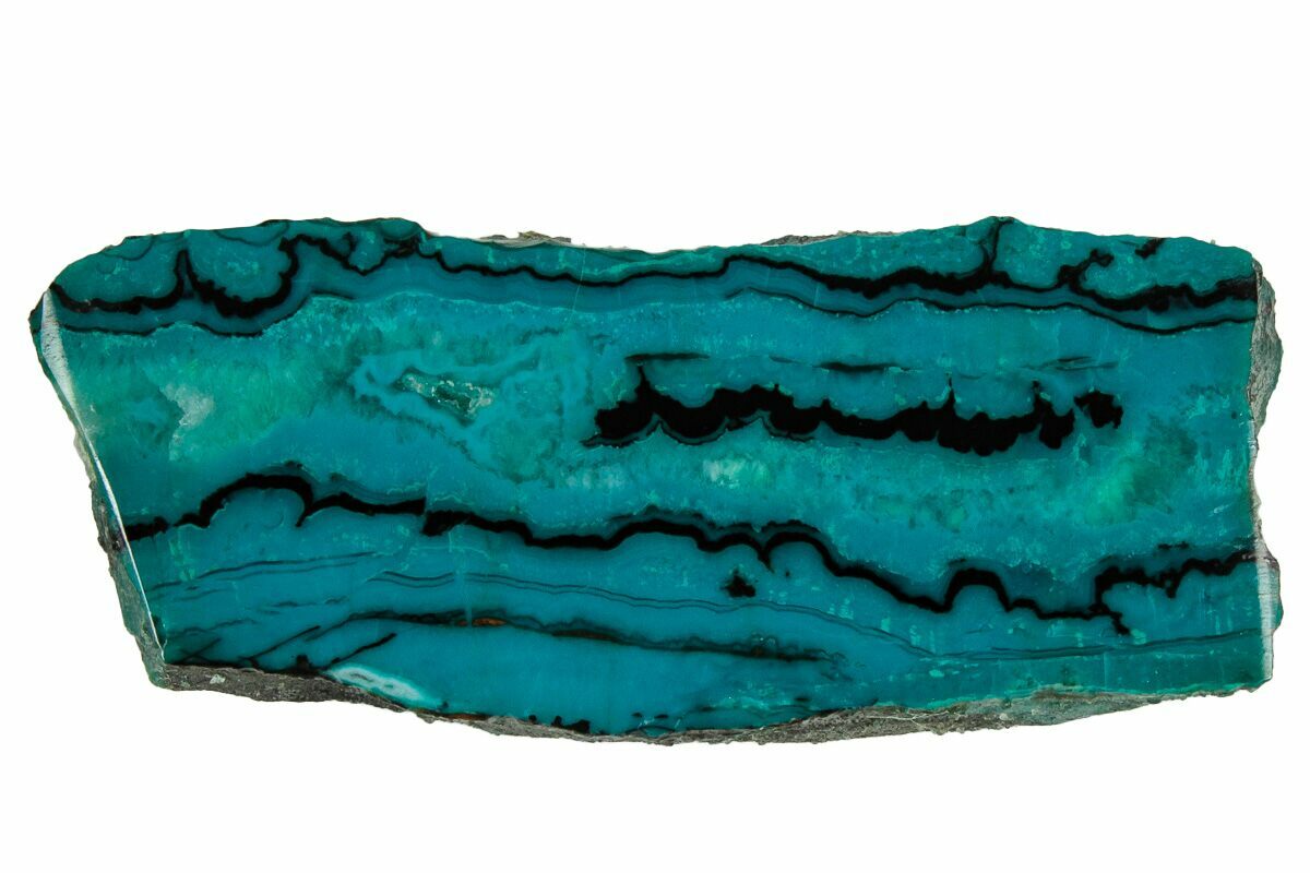 This is a vibrant, polished slab of banded chrysocolla, collected from the Bagdad Copper Mine in Arizona. It is a wonderful, banded pattern of light blue to deep blue chrysocolla that has been polished to a glossy finish on one side.