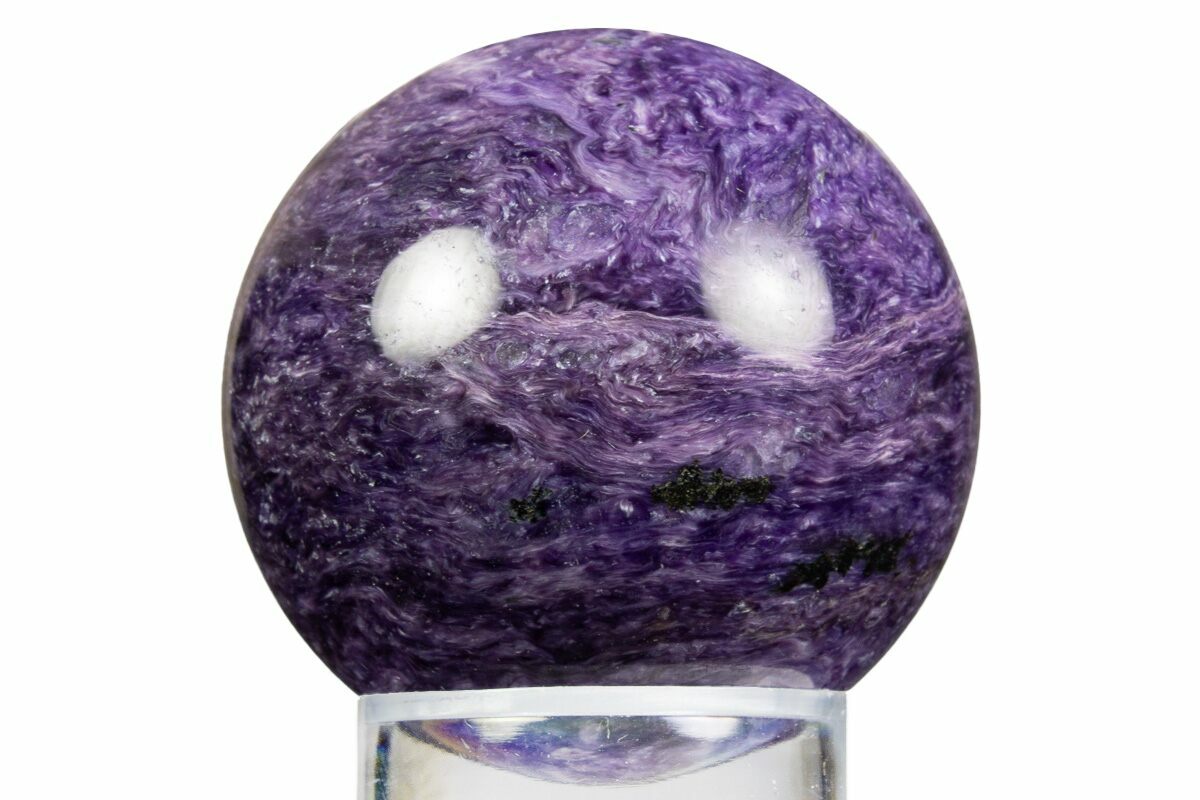 This is a beautiful polished charoite sphere from Siberia, Russia. It measures 1.9" in diameter and has been polished to a glossy finish. Comes with the pictured display stand.