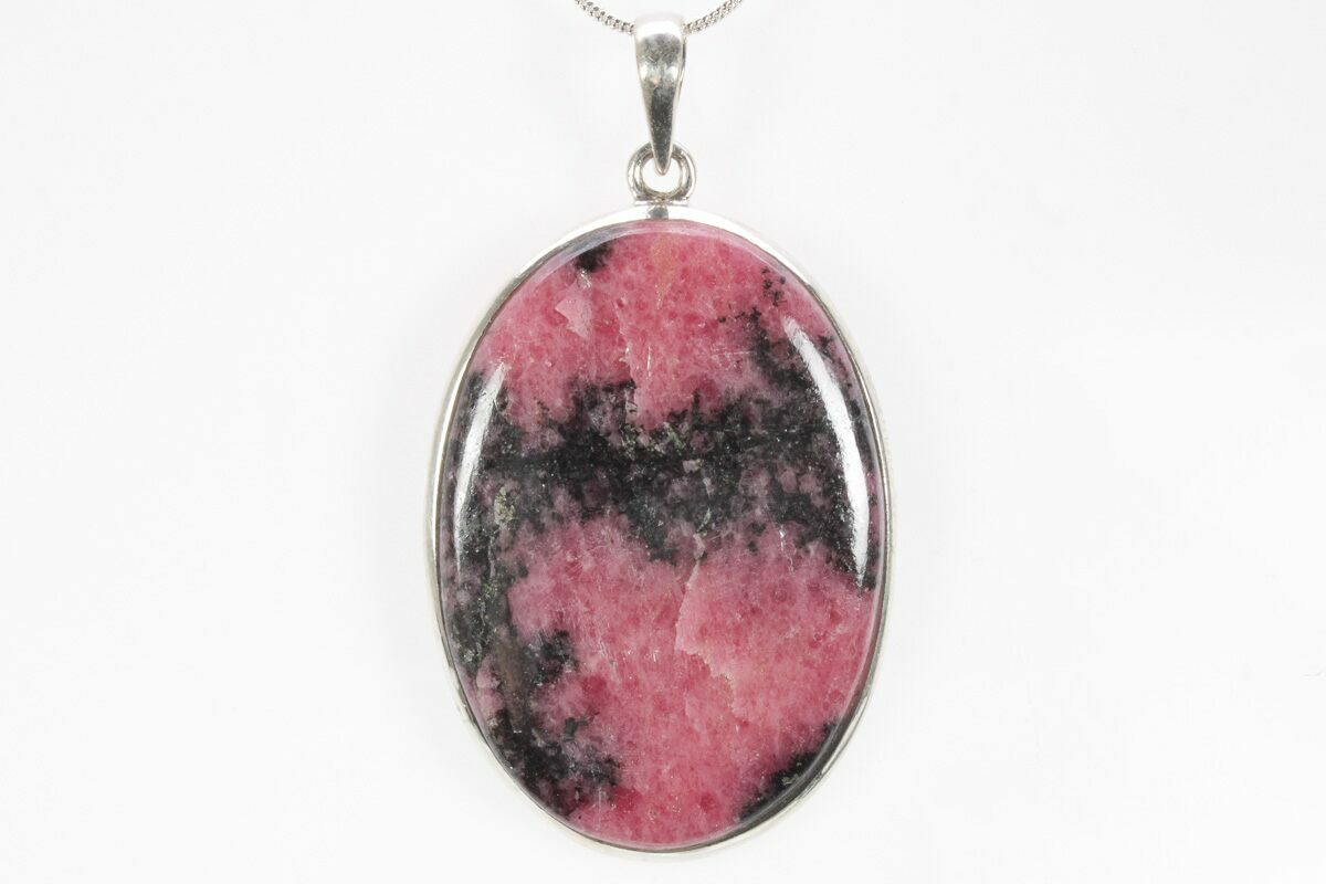 This is an eye catching, rhodonite pendant featuring a beautiful, polished rhodonite stone set in 91.95 sterling silver. The pendant itself is 2" tall. A 24" silver plated chain with a lobster clasp is included with the pendant. You will receive the exact pendant pictured.