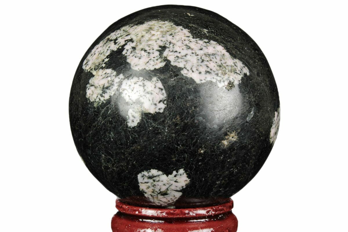 This is a 1.9" wide polished sphere made from Pakistan snowflake stone. It comes with a small acrylic ring stand.