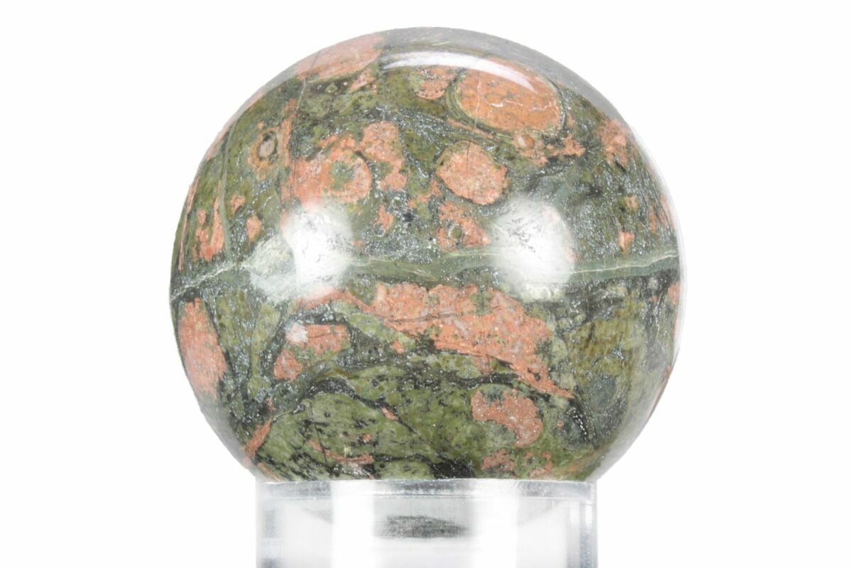 This is an exceptionally colorful 1.9" wide polished spherulitic rhyolite stone, collected from Turee Creek Station, near the town of Newman in Western Australia. It has been shaped into a perfect sphere and polished to a glossy finish. Spherulites are the small rounded orange/pink bodies within the mossy green rhyolite.