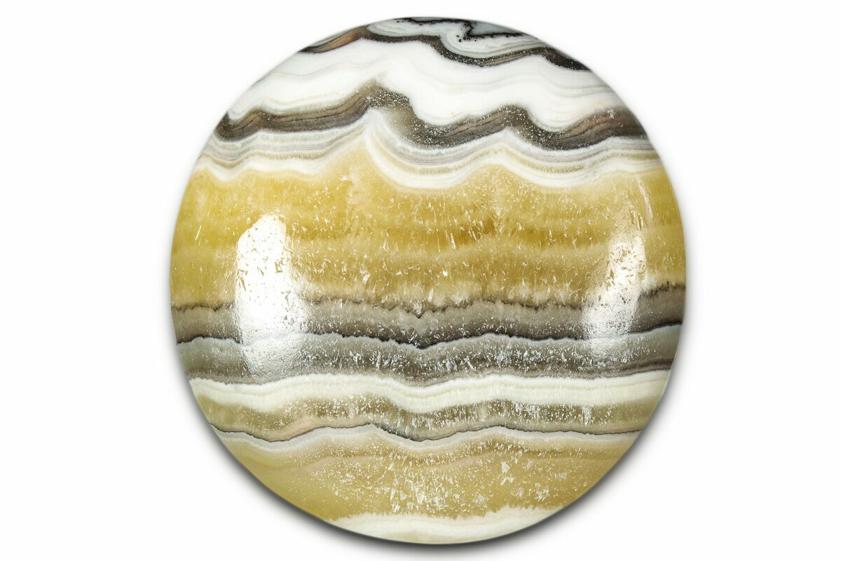 This is a 1.9" wide polished palm stone of banded zebra calcite from Nuevo León, Mexico, expertly polished to reveal its striking natural striping.